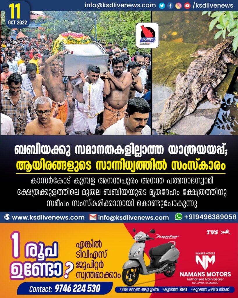 കാസർകോട് ∙ കുമ്പള അനന്തപുരം അനന്ത പത്മനാഭസ്വാമി ക്ഷേത്രക്കുളത്തിലെ മുതല ‘ബബിയ’യ്ക്കു വിശ്വാസികളുടെ യാത്രാമൊഴി. കുമ്പള അനന്തപുരം അനന്ത പത്മനാഭസ്വാമി ക്ഷേത്രക്കുളത്തിലെ മുതല ഞായർ രാത്രി പത്തോടെ പൊങ്ങിക്കിടക്കുന്നതു കണ്ടു പരിശോധിച്ചപ്പോഴാണ് ജീവൻ നഷ്ടമായതായി കണ്ടെത്തിയത്. ഇന്നലെ ഉച്ചയോടെ ആയിരങ്ങളുടെ സാന്നിധ്യത്തിൽ ബബിയയുടെ സംസ്കാര ചടങ്ങുകൾ ക്ഷേത്രപരിസരത്ത് നടത്തി.