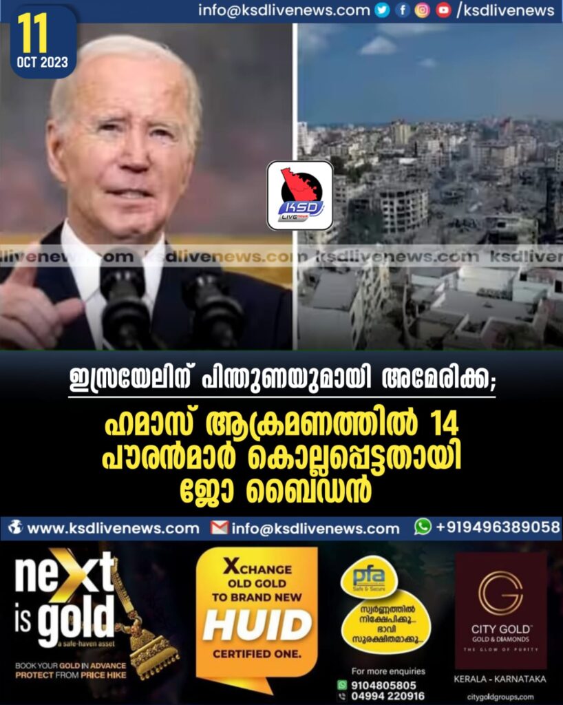 ഇസ്രയേലിന് പിന്തുണയുമായി അമേരിക്ക; ഹമാസ് ആക്രമണത്തിൽ 14 പൗരൻമാർ കൊല്ലപ്പെട്ടതായി ജോ ബൈഡൻ