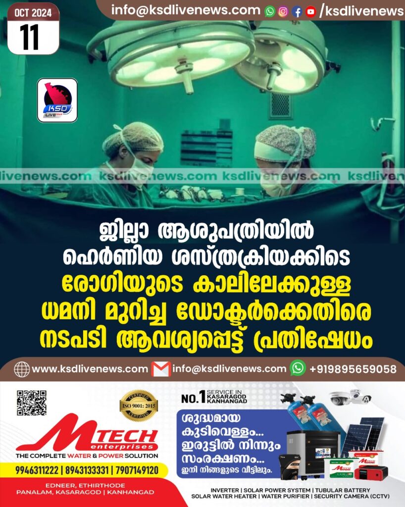 ജില്ലാ ആശുപത്രിയിൽ ഹെര്ണിയ ശസ്ത്രക്രിയക്കിടെ രോഗിയുടെ കാലിലേക്കുള്ള ധമനി മുറിച്ച ഡോക്ടര്ക്കെതിരെ നടപടി ആവശ്യപ്പെട്ട് പ്രതിഷേധം
