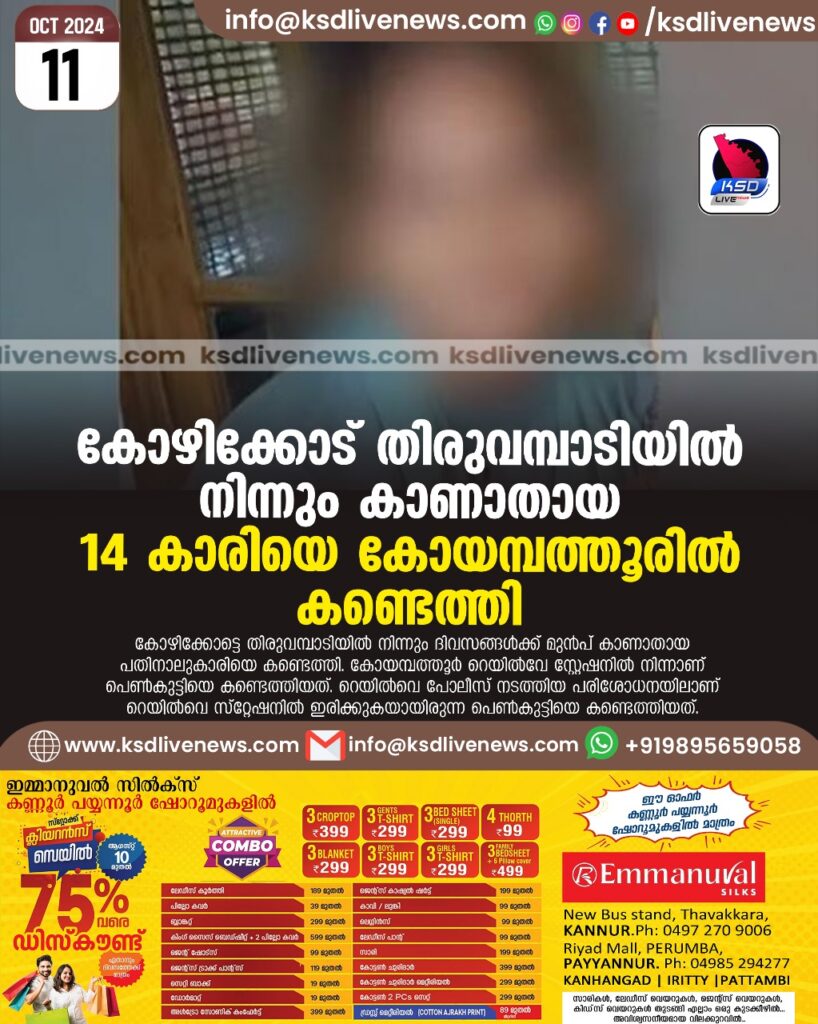 കോഴിക്കോട് തിരുവമ്പാടിയില് നിന്നും കാണാതായ 14കാരിയെ കോയമ്പത്തൂരില് കണ്ടെത്തി