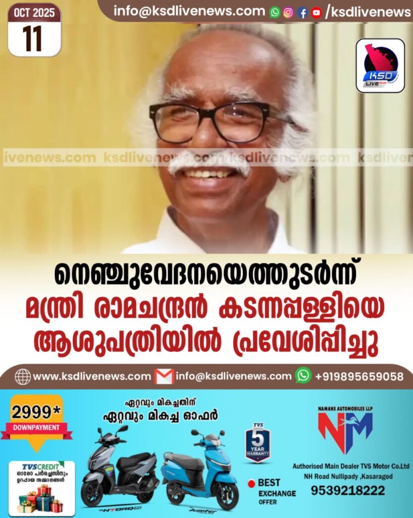 നെഞ്ചുവേദനയെത്തുടര്ന്ന് മന്ത്രി രാമചന്ദ്രന് കടന്നപ്പള്ളിയെ ആശുപത്രിയില് പ്രവേശിപ്പിച്ചു