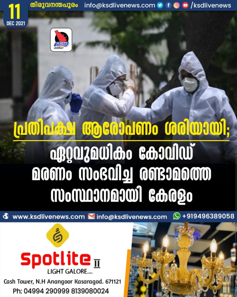 പ്രതിപക്ഷ ആരോപണം ശരിയായി; ഏറ്റവുമധികം കോവിഡ് മരണം സംഭവിച്ച രണ്ടാമത്തെ സംസ്ഥാനമായി കേരളം