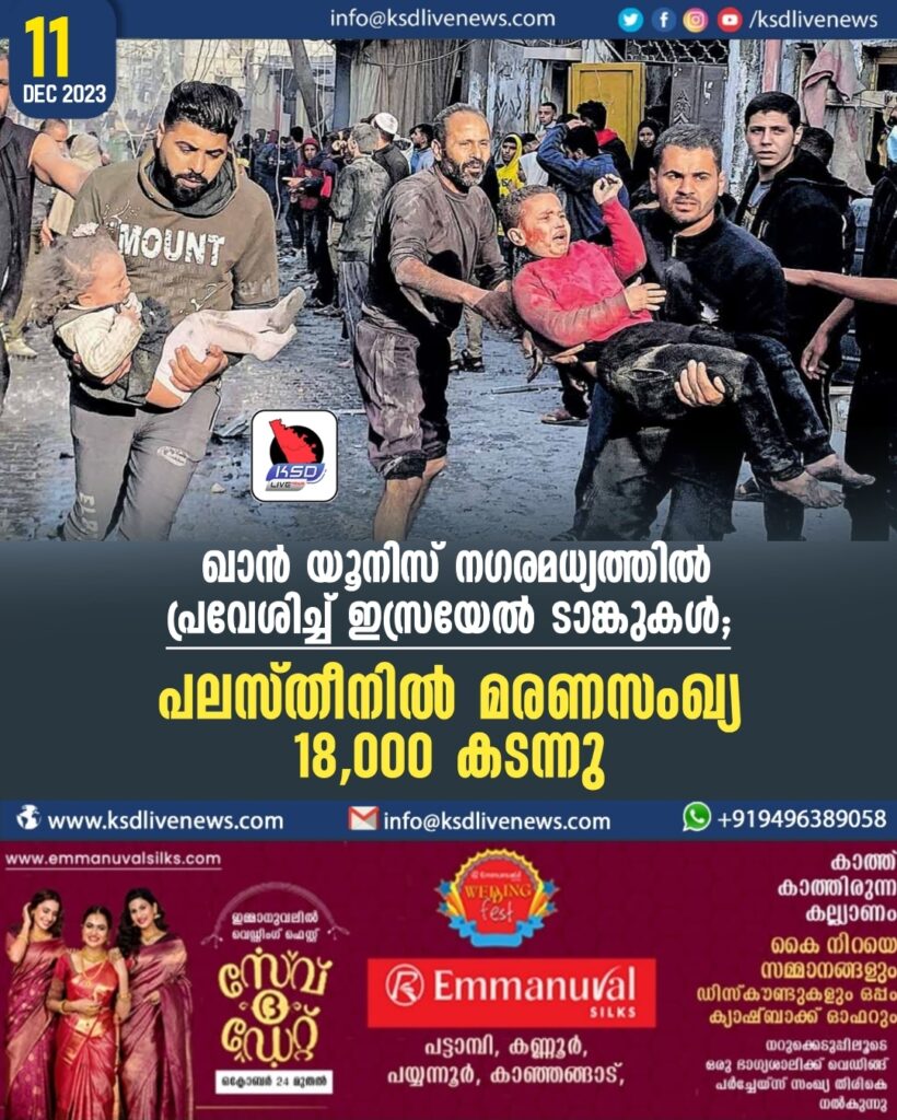 ഖാൻ യൂനിസ് നഗരമധ്യത്തിൽ പ്രവേശിച്ച് ഇസ്രയേൽ ടാങ്കുകൾ; പലസ്തീനിൽ മരണസംഖ്യ 18,000 കടന്നു