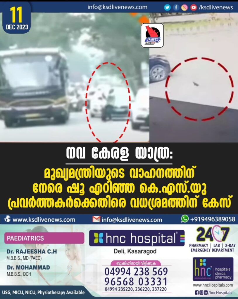 നവകേരള യാത്ര: മുഖ്യമന്ത്രിയുടെ വാഹനത്തിന് നേരെ ഷൂ എറിഞ്ഞ കെ.എസ്.യു പ്രവർത്തകർക്കെതിരെ വധശ്രമത്തിന് കേസ്