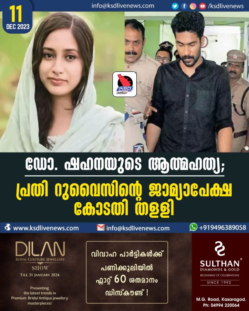 ഡോ. ഷഹനയുടെ ആത്മഹത്യ; പ്രതി റുവൈസിന്റെ ജാമ്യാപേക്ഷ കോടതി തളളി