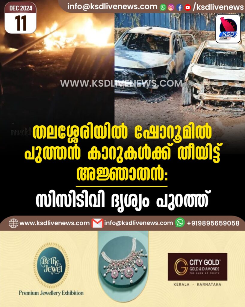 തലശ്ശേരിയിൽ ഷോറൂമിൽ പുത്തൻ കാറുകൾക്ക് തീയിട്ട് അജ്ഞാതൻ, സിസിടിവി ദൃശ്യം പുറത്ത്.