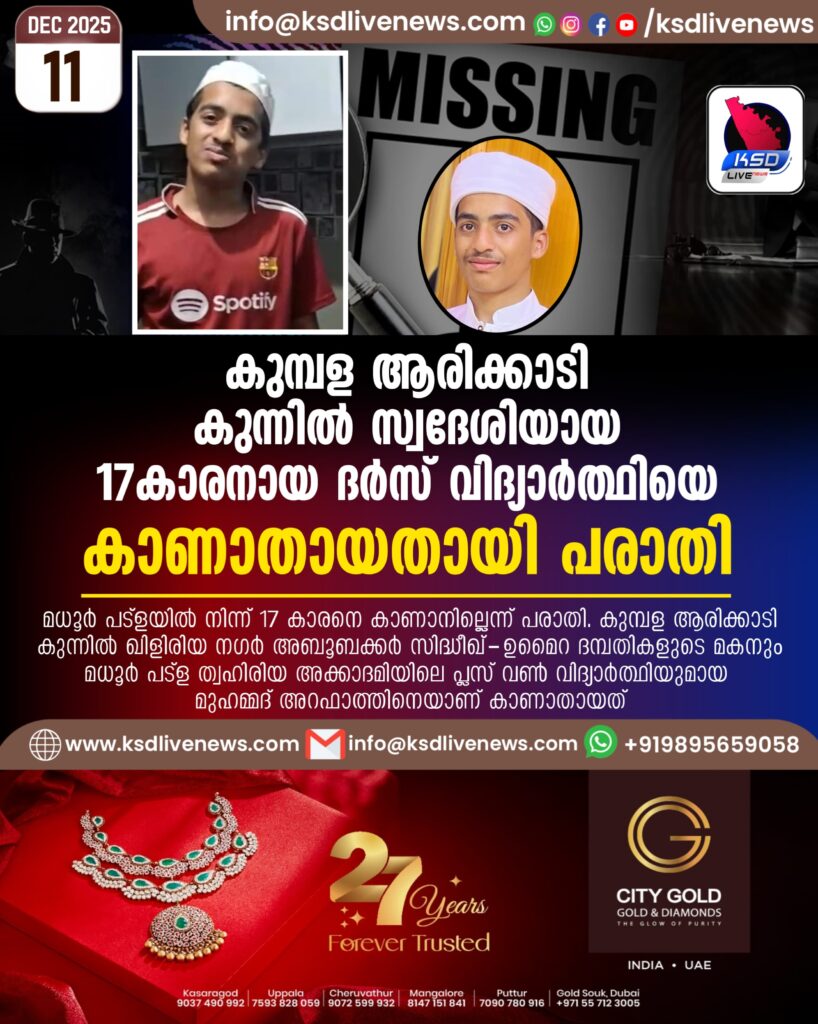 കുമ്പള ആരിക്കാടി കുന്നിൽ സ്വദേശിയായ 17കാരനായ ദർസ് വിദ്യാർത്ഥിയെ കാണാതായതായി പരാതി
