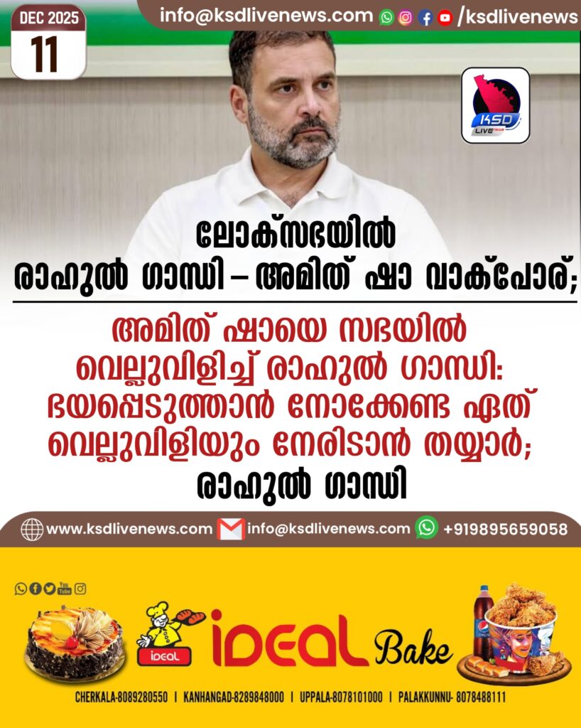 ലോക്സഭയില് രാഹുല് ഗാന്ധി -അമിത് ഷാ വാക്പോര്; അമിത് ഷായെ സഭയില് വെല്ലുവിളിച്ച് രാഹുല് ഗാന്ധി: ഭയപ്പെടുത്താൻ നോക്കേണ്ട ഏത് വെല്ലുവിളിയും നേരിടാൻ തയ്യാർ; രാഹുൽ ഗാന്ധി