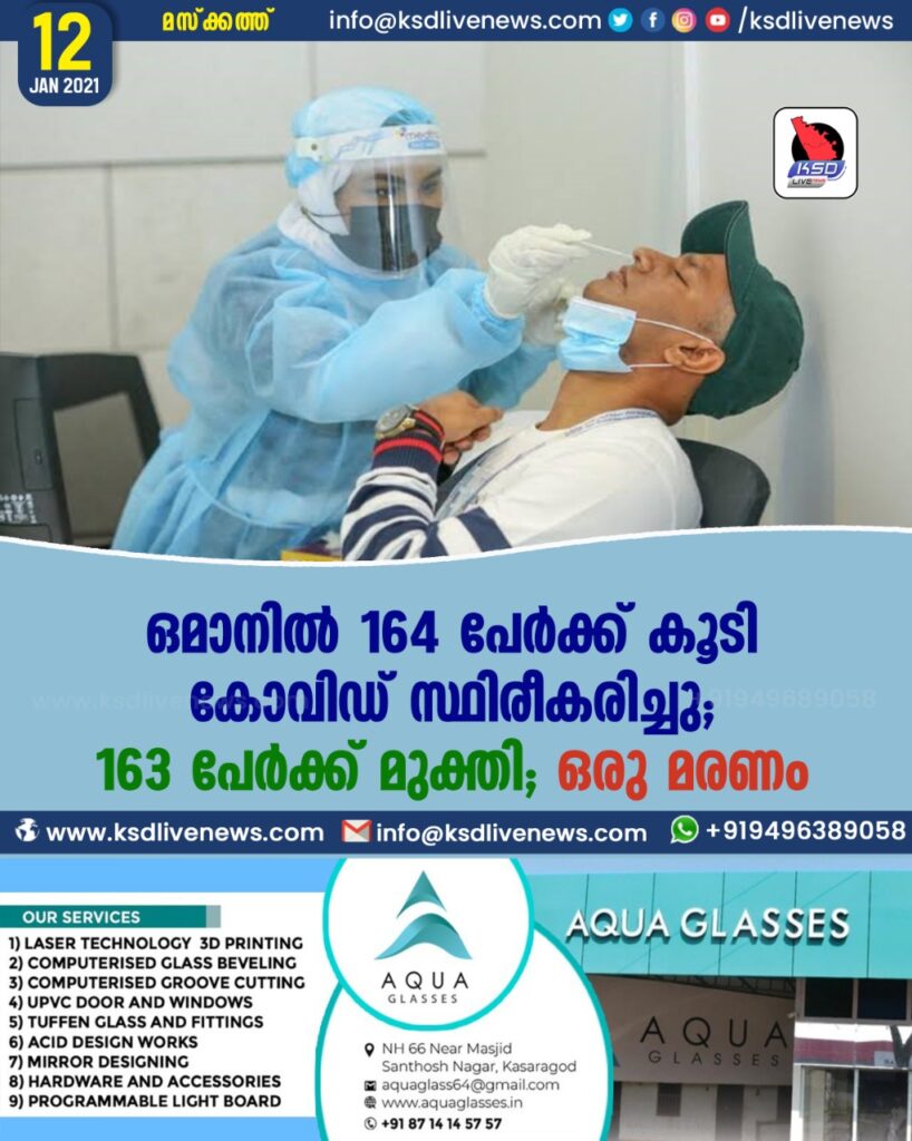 ഒമാനില് 164 പേര്ക്ക് കൂടി കോവിഡ് സ്ഥിരീകരിച്ചു; 163 പേർക്ക് മുക്തി; ഒരു മരണം