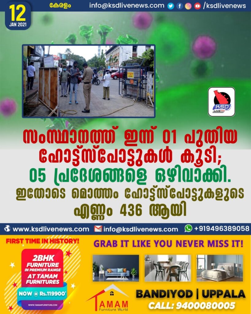 ഇന്ന് 5 പ്രദേശങ്ങളെ ഹോട്ട് സ്പോട്ടില് നിന്നും ഒഴിവാക്കി. ഇതോടെ നിലവില് ആകെ 436 ഹോട്ട് സ്പോട്ടുകളാണുള്ളത്.