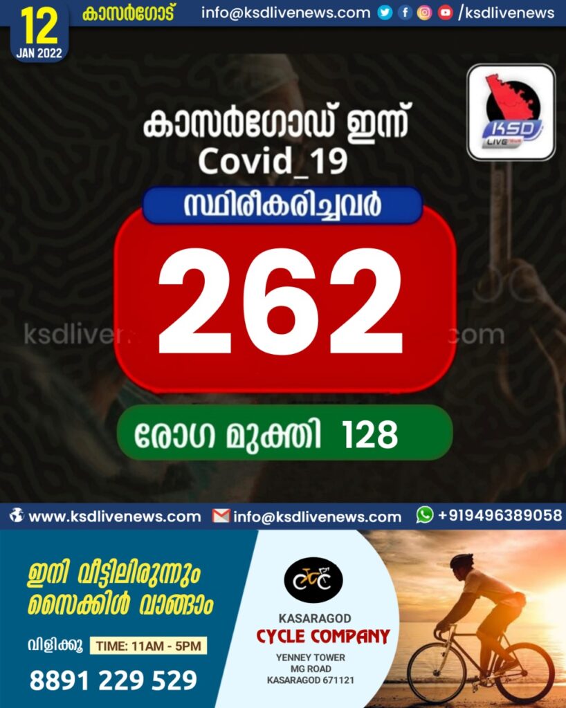 12.01.2022 കാസര്കോട് 262 ജില്ലയിൽ പേര് കൂടി കോവിഡ്-19 പോസിറ്റീവായി. ചികിത്സയിലുണ്ടായിരുന്ന 128