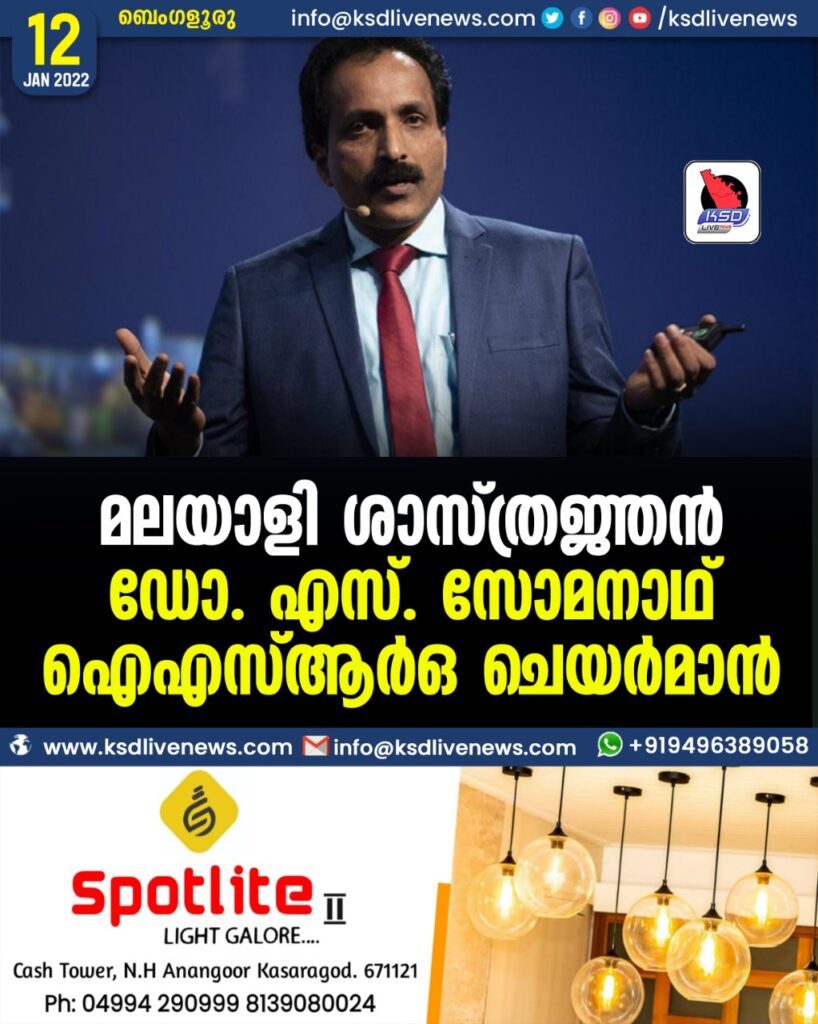 ബെംഗളൂരു: മലയാളി ശാസ്ത്രജ്ഞൻ ഡോ. എസ് സോമനാഥ് ഐഎസ്ആർഒയുടെ ചെയർമാൻ. നിലവിൽ തിരുവനന്തപുരം വിക്രം സാരാഭായ് സ്പേസ് സെന്ററിന്റെ ഡയറക്ടറാണ്.
