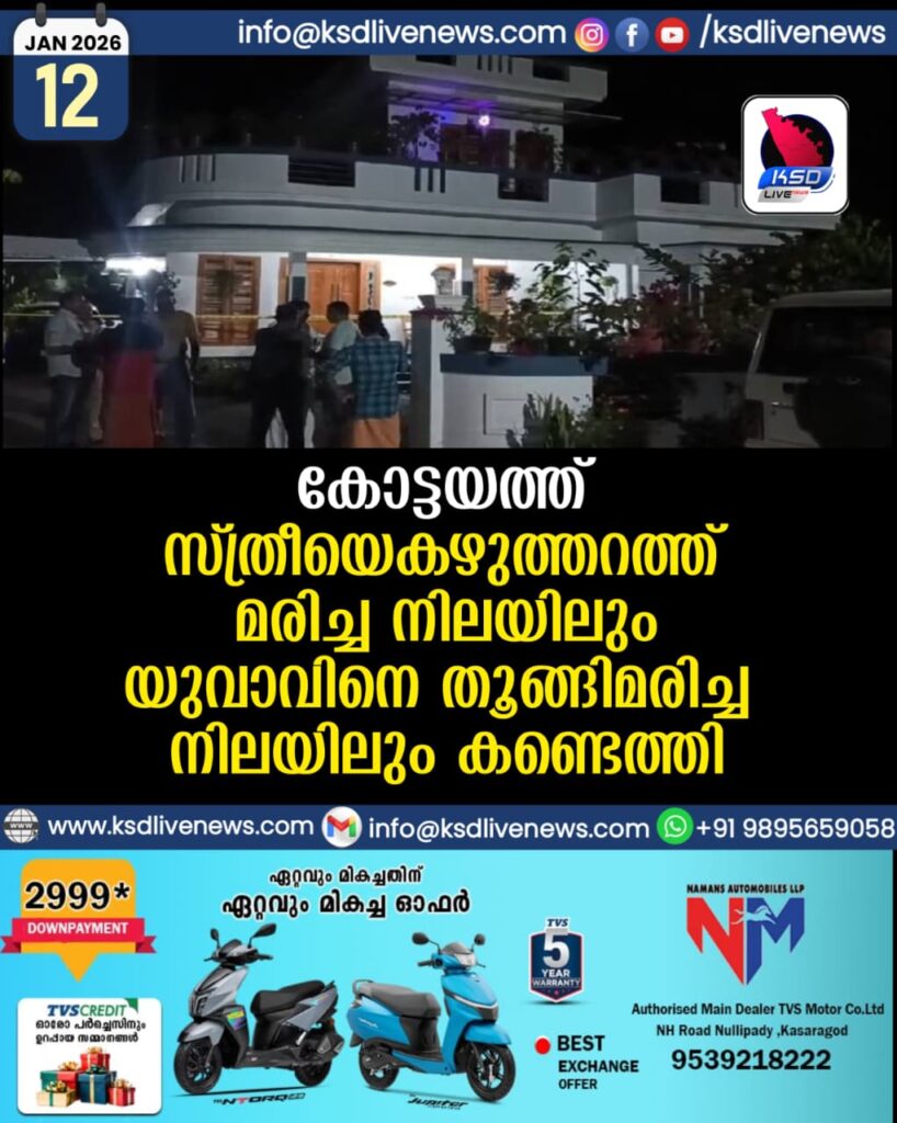 കോട്ടയത്ത് സ്ത്രീയെ കഴുത്തറത്ത് മരിച്ച നിലയിലും യുവാവിനെ തൂങ്ങിമരിച്ച നിലയിലും കണ്ടെത്തി