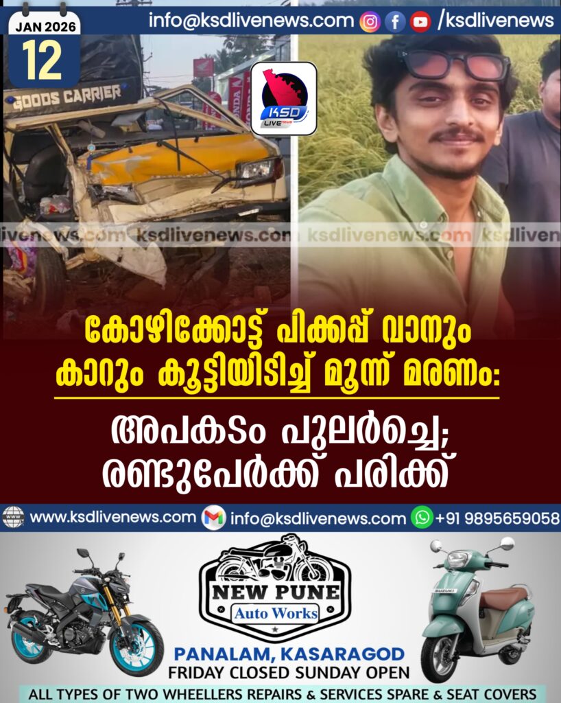 കോഴിക്കോട്ട് പിക്കപ്പ് വാനും കാറും കൂട്ടിയിടിച്ച് മൂന്ന് മരണം: അപകടം പുലർച്ചെ; രണ്ടുപേർക്ക് പരിക്ക്