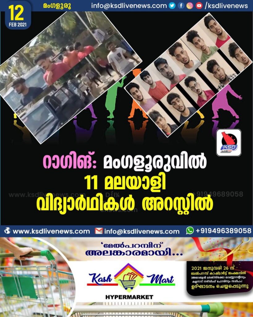 റാഗിങ്: മംഗളൂരുവിൽ 11 മലയാളി വിദ്യാർഥികൾ അറസ്റ്റിൽ
