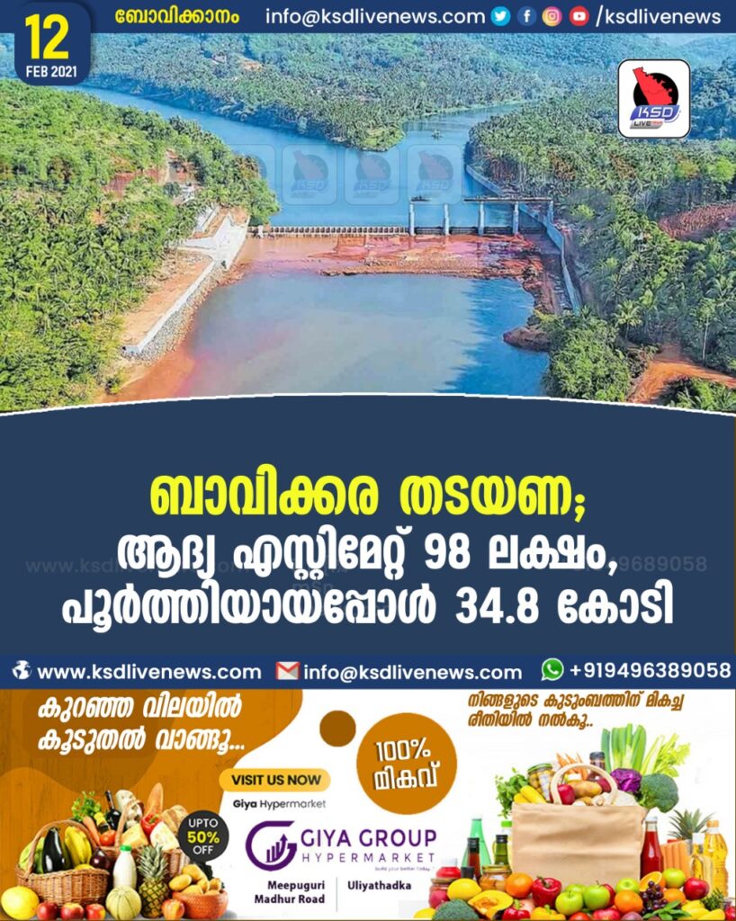 ബാവിക്കര തടയണ: ആദ്യ എസ്റ്റിമേറ്റ് 98 ലക്ഷം, പൂർത്തിയായപ്പോൾ 34.8 കോടി !