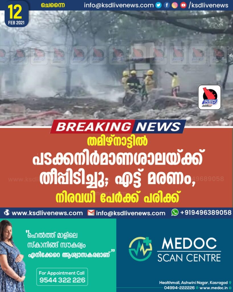 തമിഴ്നാട്ടില്‍ പടക്കനിര്‍മാണശാലയ്ക്ക് തീപ്പിടിച്ചു; എട്ട് മരണം, നിരവധി പേര്‍ക്ക് പരിക്ക്