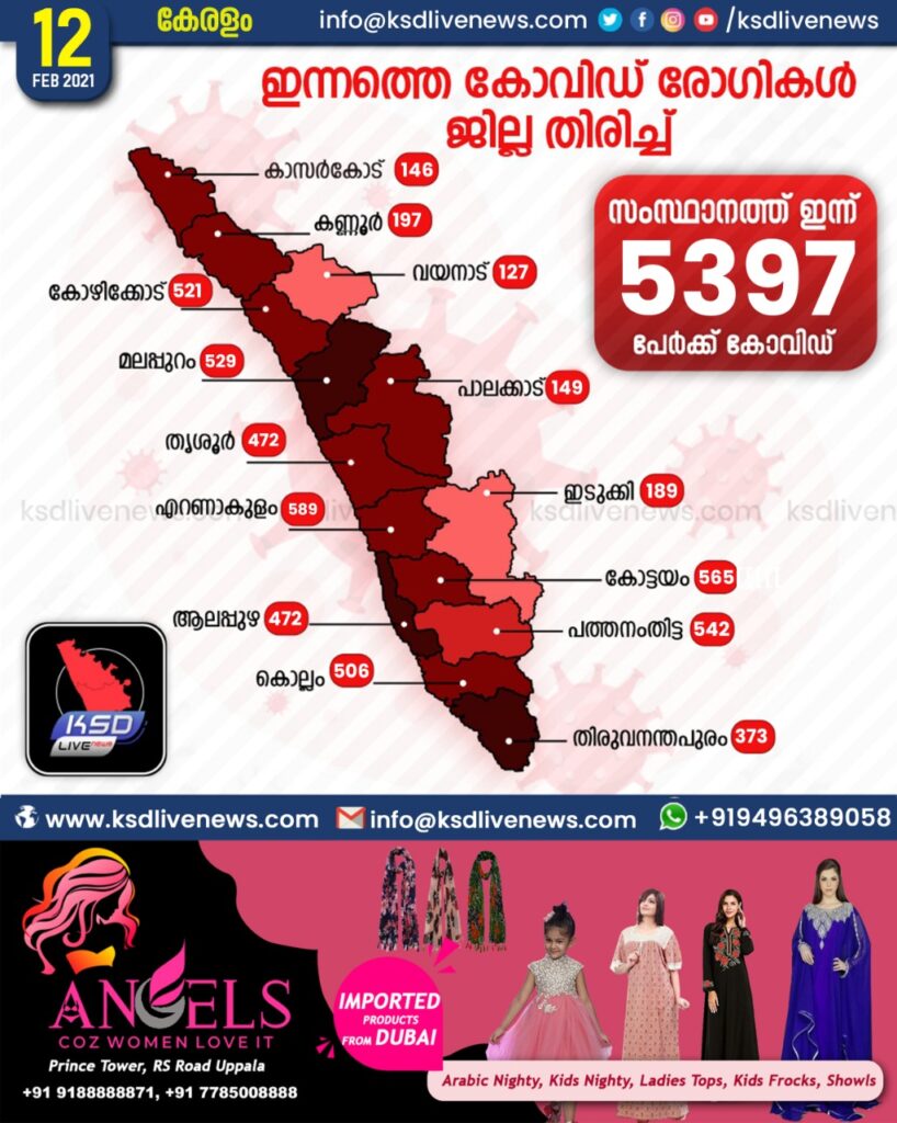 സംസ്ഥാനത്ത് ഇന്ന് 5397 പേര്ക്ക് കോവിഡ്-19 സ്ഥിരീകരിച്ചു. എറണാകുളം 589, കോട്ടയം 565, പത്തനംതിട്ട 542, മലപ്പുറം 529, കോഴിക്കോട് 521, കൊല്ലം 506, ആലപ്പുഴ 472, തൃശൂര് 472, തിരുവനന്തപുരം 393, കണ്ണൂര് 197, ഇടുക്കി 189, പാലക്കാട് 149, കാസര്ഗോഡ് 146, വയനാട് 127 എന്നിങ്ങനേയാണ് ജില്ലകളില് ഇന്ന് രോഗ ബാധ സ്ഥിരീകരിച്ചത്.