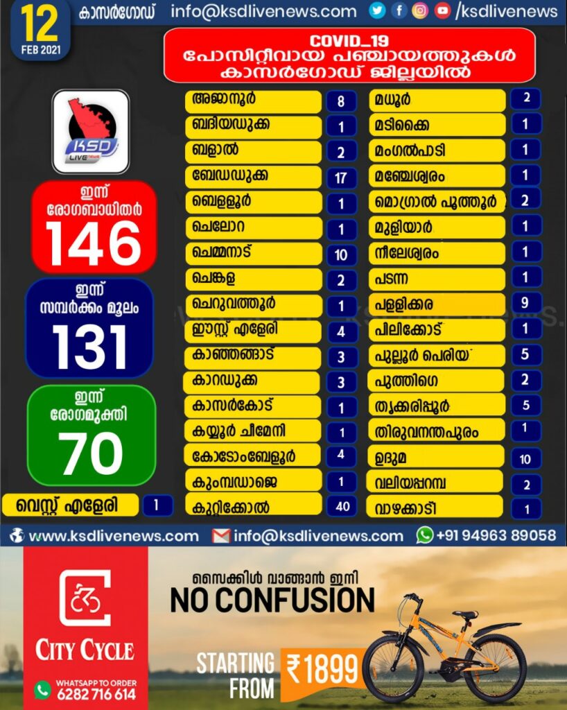 കാസർഗോഡ് ജില്ലയിൽ ഇന്ന് കോവിഡ് സ്ഥിരീകരിച്ചവരുടെ പഞ്ചായത്ത് തിരിച്ചുള്ള സ്ഥിതി വിവര കണക്ക്