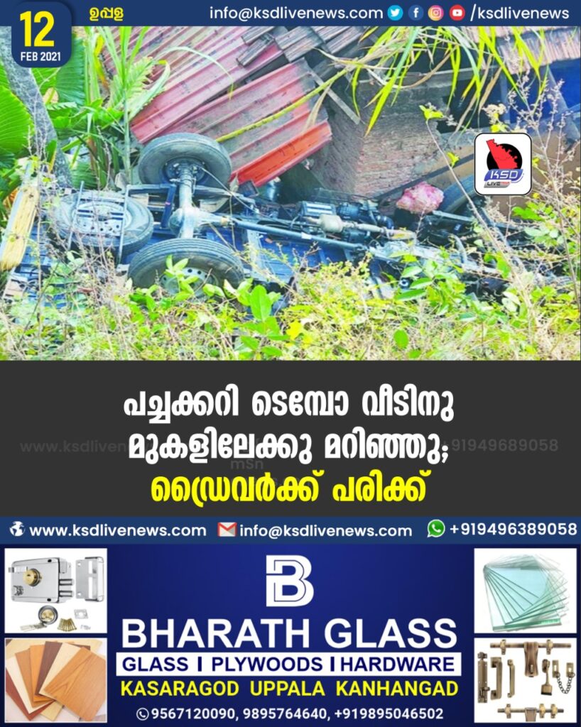 പച്ചക്കറി ടെമ്പോ വീടിനു മുകളിലേക്കു മറിഞ്ഞു ; ഡ്രൈവർക്ക് പരിക്ക്