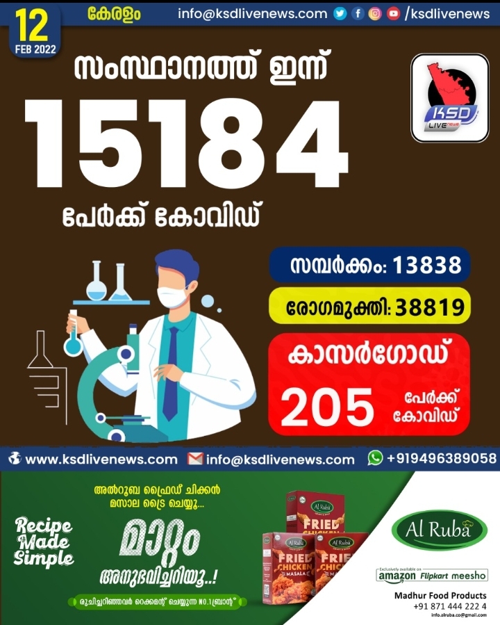 സംസ്ഥാനത്ത് ഇന്ന് 15184 കോവിഡ് സ്ഥിരീകരിച്ചു. സമ്പർക്കം വഴി 13838 പേർക്കും ; ആശ്വാസമായി 38819 പേർക്ക് രോഗമുക്തി ; കാസർഗോഡ് ജില്ലയിൽ 205 പേർക്ക് പുതിയ കോവിഡ് കേസുകൾ ; മരണം 23