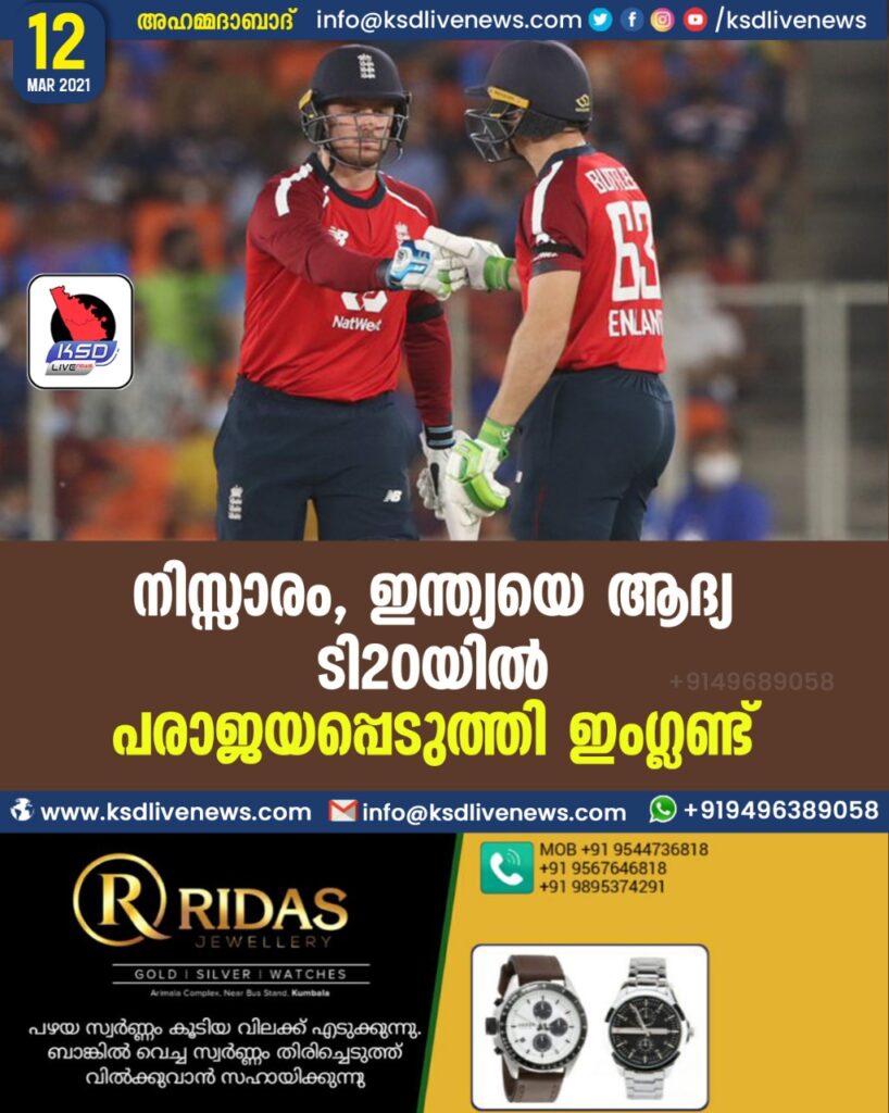 നിസ്സാരം, ഇന്ത്യയെ ആദ്യ ടി20യില് പരാജയപ്പെടുത്തി ഇംഗ്ലണ്ട്