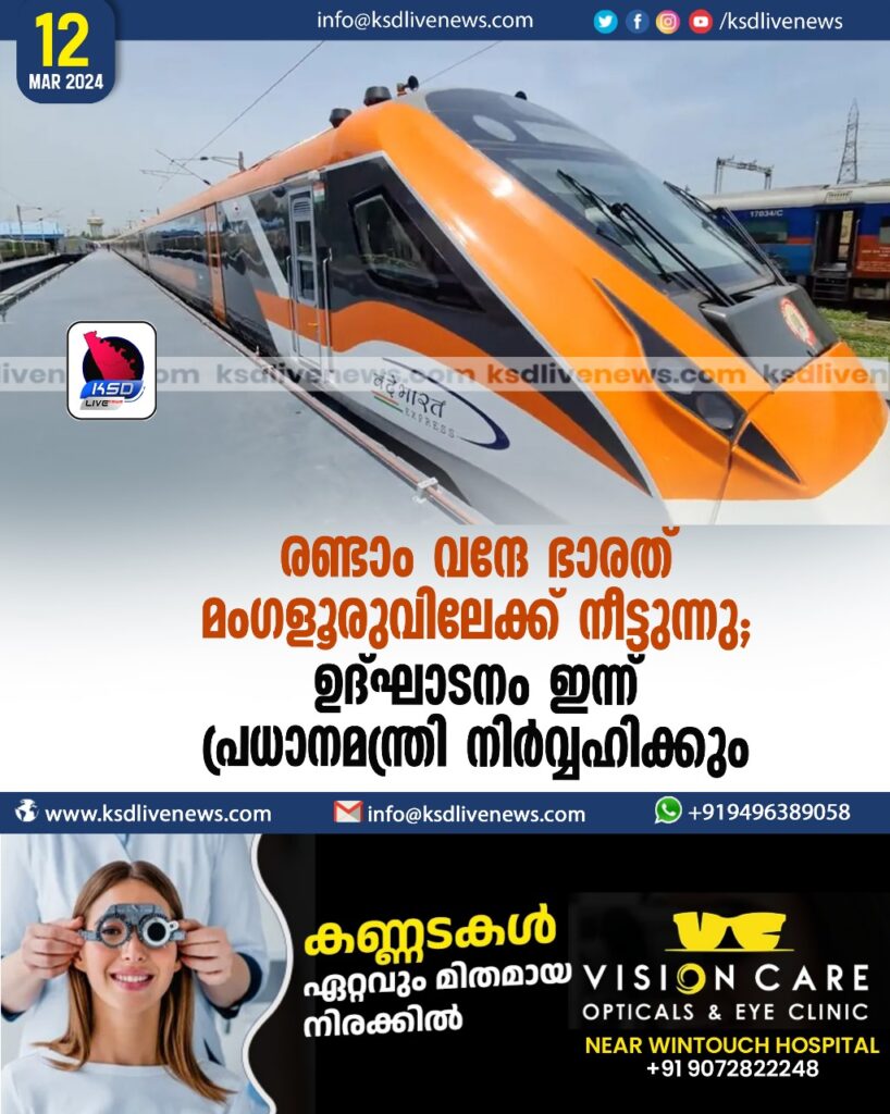 രണ്ടാം വന്ദേ ഭാരത് മംഗളൂരുവിലേക്ക് നീട്ടുന്നു; ഉദ്ഘാടനം  ഇന്ന്  പ്രധാനമന്ത്രി നിർവ്വഹിക്കും