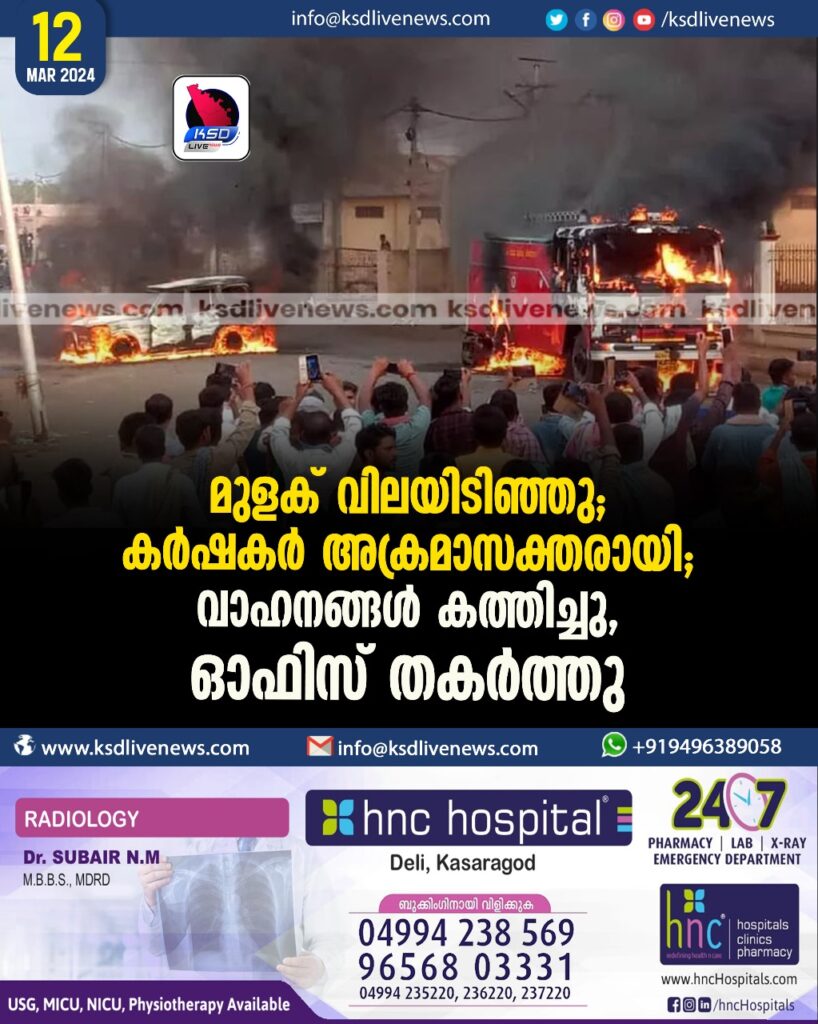 മുളക് വിലയിടിഞ്ഞു; കർഷകർ അക്രമാസക്തരായി, വാഹനങ്ങൾ കത്തിച്ചു, ഓഫിസ് തകർത്തു