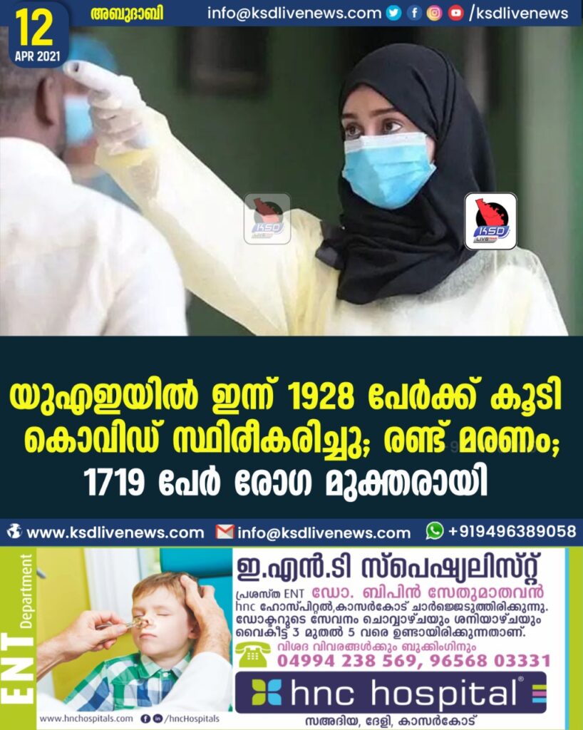 യുഎഇയില് ഇന്ന് 1928 പേര്ക്ക് കൂടി കൊവിഡ് സ്ഥിരീകരിച്ചു; രണ്ട് മരണം; 1719 പേർ രോഗ മുക്തരായി