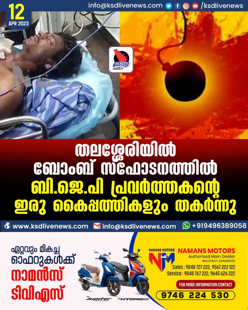 തലശ്ശേരിയിൽ ബോംബ് സ്ഫോടനത്തിൽ ബിജെപി പ്രവർത്തകന്റെ ഇരു കൈപ്പത്തികളും തകർന്നു