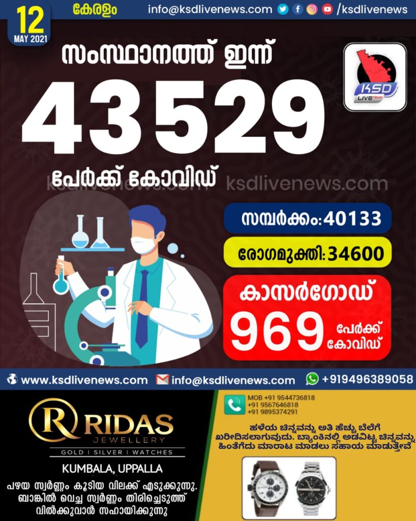 കോവിഡിൽ വിറച്ച് കേരളം ; സംസ്ഥാനത്ത് ഇന്ന് ഏറ്റവും ഉയർന്ന കോവിഡ് പ്രതിദിന കണക്ക് ; 43529 പേർക്ക് കോവിഡ് സ്ഥിരീകരിച്ചു. സമ്പർക്കം വഴി 40133 പേർക്കും ; 34600 പേർക്ക് രോഗ മുക്തിയും ; കാസർഗോഡ് ജില്ലയിൽ 969 പേർക്ക് കോവിഡ് ; മരണം 95