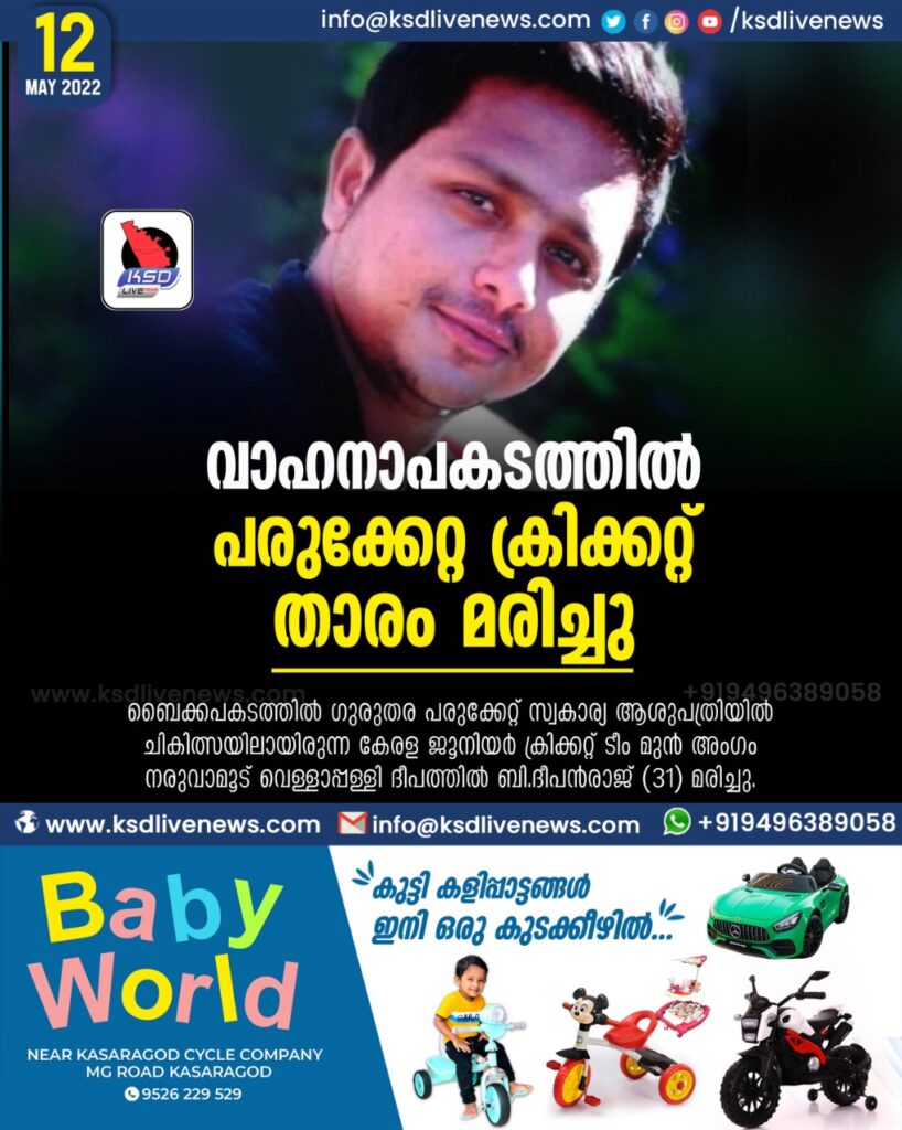 തിരുവനന്തപുരം ∙ ബൈക്കപകടത്തിൽ ഗുരുതര പരുക്കേറ്റ് സ്വകാര്യ ആശുപത്രിയിൽ ചികിത്സയിലായിരുന്ന കേരള ജൂനിയർ ക്രിക്കറ്റ് ടീം മുൻ അംഗം നരുവാമൂട് വെള്ളാപ്പള്ളി ദീപത്തിൽ ബി.ദീപൻരാജ് (31) മരിച്ചു. തിങ്കളാഴ്ച രാത്രി 11.30ന് വഴുതക്കാട് ശ്രീമൂലം ക്ലബ്ബിനു സമീപമായിരുന്നു അപകടം. സംസ്കാരം നടത്തി.