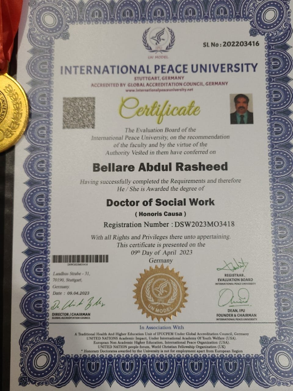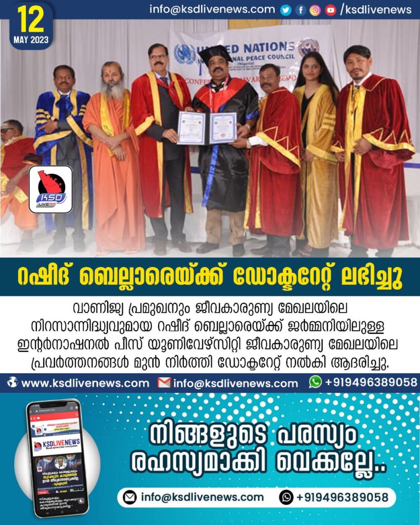 വാണിജ്യ പ്രമുഖനും ജീവകാരുണ്യ മേഖലയിലെ നിറസാന്നിദ്ധ്യവുമായ റഷീദ് ബെല്ലാരെയ്ക്ക് ജർമ്മനിയിലുള്ള ഇന്റർനാഷനൽ പീസ് യൂണിവേഴ്സിറ്റി ജീവകാരുണ്യ മേഖലയിലെ പ്രവർത്തനങ്ങൾ മുൻ നിർത്തി ഡോക്ടറേറ്റ് നൽകി ആദരിച്ചു.