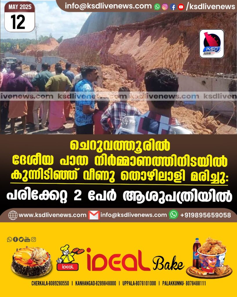 ചെറുവത്തൂരില് ദേശീയ പാത നിര്മ്മാണത്തിനിടയില് കുന്നിടിഞ്ഞ് വീണു തൊഴിലാളി മരിച്ചു: പരിക്കേറ്റ 2 പേര് ആശുപത്രിയില്