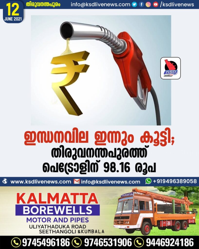 ഇന്ധനവില ഇന്നും കൂട്ടി; തിരുവനന്തപുരത്ത് പെട്രോളിന് 98.16 രൂപ
