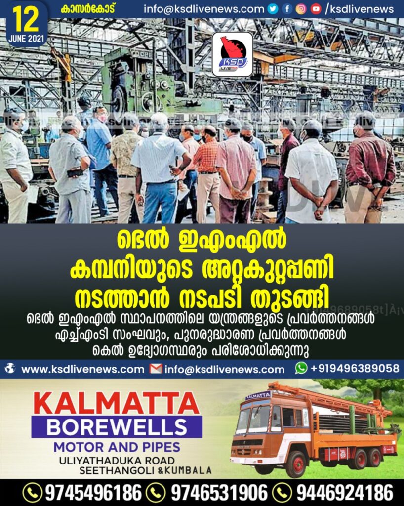 കാസർകോട് ∙ ഭെൽ ഇഎംഎൽ കമ്പനിയുടെ 51 ശതമാനം ഓഹരികൾ സംസ്ഥാന സർക്കാർ ഏറ്റെടുക്കുന്ന സാഹചര്യത്തിൽ ഒരു വർഷത്തിലധികമായി അടച്ചിട്ട ഫാക്ടറിയുടെ അറ്റകുറ്റ പ്രവൃത്തികൾ നടത്താൻ സംസ്ഥാന സർക്കാർ നടപടികൾ ആരംഭിച്ചു.യന്ത്രങ്ങളുടെ പ്രവർത്തനങ്ങൾ പരിശോധിക്കാൻ എച്ച്എംടിയുടെ പ്രതിനിധികളും ഫാക്ടറി കെട്ടിടത്തിന്റെ പുനരുദ്ധാരണ പ്രവർത്തനങ്ങൾ പരിശോധിക്കാൻ കെല്ലിൽ നിന്നുള്ള ഉദ്യോഗസ്ഥരും കമ്പനി സന്ദർശിച്ചു. പുനരുദ്ധാരണത്തിനും അറ്റകുറ്റ പ്രവൃത്തികൾക്കും വിശദമായ എസ്റ്റിമേറ്റ് സംഘം 15ന് അകം സംസ്ഥാന സർക്കാരിനു നൽകും. ഓഹരികൾ തിരികെ നൽകാൻ മേയ് 11നാണ് കേന്ദ്ര സർക്കാർ തീരുമാനിച്ച് സംസ്ഥാന സർക്കാരിനെ അറിയിച്ചത്. കൈമാറ്റ നടപടികൾക്കു നേതൃത്വം നൽകാൻ പൊതുമേഖലാ പുനരുദ്ധാരണ ബോർഡിനെ (റിയാബ്)യാണ് സംസ്ഥാന സർക്കാർ ചുമതലപ്പെടുത്തിയിട്ടുള്ളത്. ഉടൻ ഓഹരികൾ ഏറ്റെടുത്ത് കമ്പനി തുറന്ന് പ്രവർത്തിപ്പിക്കുക, ജീവനക്കാരുടെ 30 മാസമായി മുടങ്ങിക്കിടക്കുന്ന ശമ്പളം ഉൾപ്പെടെ ആനുകൂല്യങ്ങൾ ഉടൻ അനുവദിക്കുക, പ്രക്ഷോഭത്തിനിറങ്ങിയ തൊഴിലാളി സംഘടനകളുടെ യോഗം വിളിച്ച് ചേർക്കുക തുടങ്ങിയ ആവശ്യങ്ങൾ ഉന്നയിച്ച് യൂണിയനുകൾ വ്യവസായ മന്ത്രിക്കു നിവേദനം നൽകിയിട്ടുണ്ട്.ജൂൺ 3 നും 4 നും ബന്ധപ്പെട്ട സ്ഥാപനങ്ങളുടെ ഉദ്യോഗസ്ഥ പ്രതിനിധികളുമായി വ്യവസായ വകുപ്പ് ചർച്ച നടത്തിയിരുന്നു