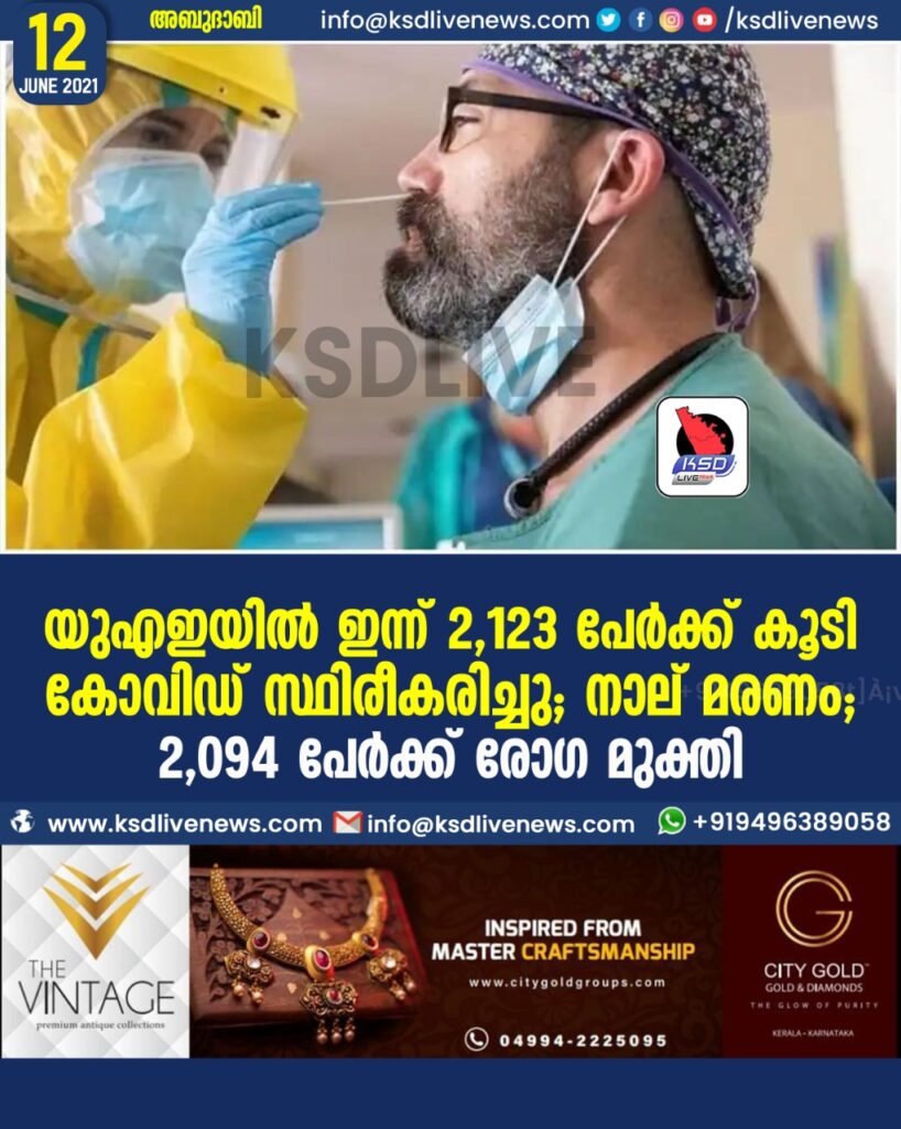 യുഎഇയില് ഇന്ന് 2123 പേര്ക്ക് കൂടി കോവിഡ് സ്ഥിരീകരിച്ചു; നാല് മരണം; 2094 പേർക്ക് രോഗ മുക്തി