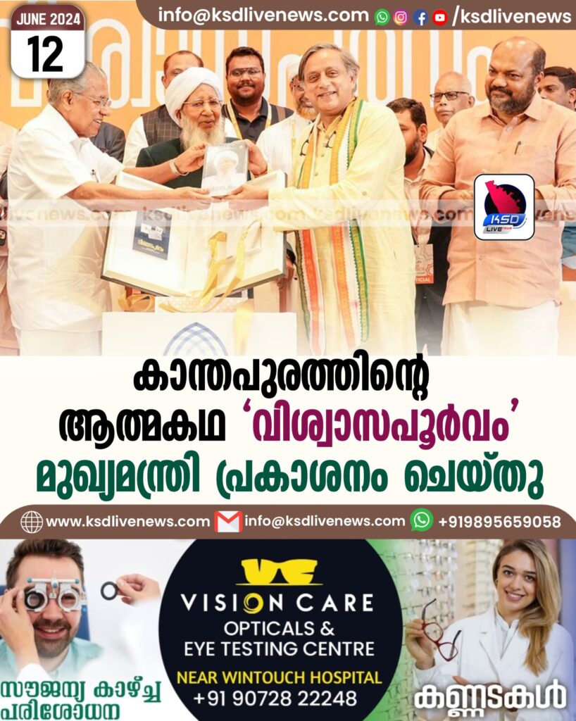 തിരുവനന്തപുരം: ഇന്ത്യൻ ഗ്രാൻഡ് മുഫ്തി കാന്തപുരം എ പി അബൂബക്കർ മുസ്ലിയാരുടെ ആത്മകഥ “വിശ്വാസപൂർവം’ തിരുവനന്തപുരത്ത് മുഖ്യമന്ത്രി പിണറായി വിജയൻ പ്രകാശനം ചെയ്തു. ഹയാത്ത് റീജൻസിയിൽ നടന്ന ചടങ്ങിൽ മുഖ്യമന്ത്രിയിൽ നിന്ന് ശശി തരൂര് എംപി പുസ്തകത്തിന്റെ ആദ്യ പ്രതി സ്വീകരിച്ചു. രാഷ്ട്രീയ, സാംസ്കാരിക, വ്യാവസായിക രംഗത്തെ പ്രശസ്തരും സ്വദേശത്തും വിദേശത്തുമുള്ള പൗരപ്രമുഖരും സംബന്ധിച്ചു.