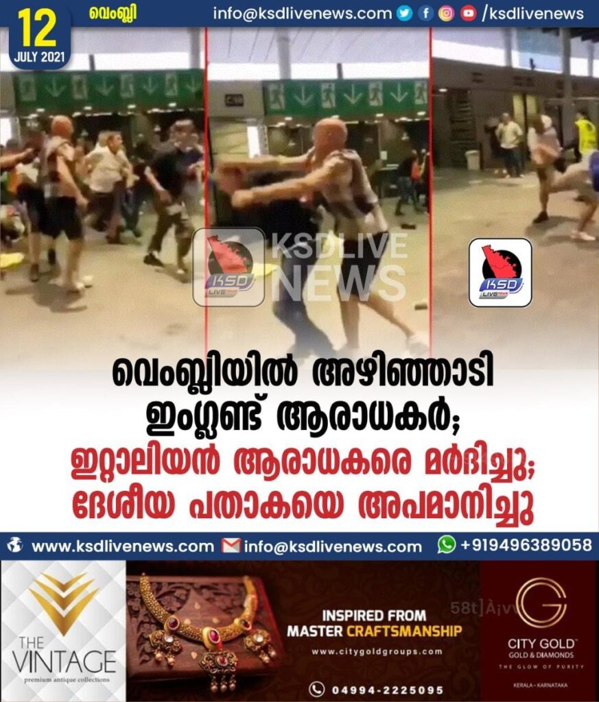 വെംബ്ലിയില് അഴിഞ്ഞാടി ഇംഗ്ലണ്ട് ആരാധകര്; ഇറ്റാലിയന് ആരാധകരെ മര്ദിച്ചു, ദേശീയ പതാകയെ അപമാനിച്ചു – video