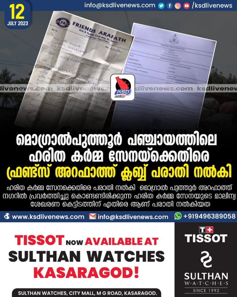 മൊഗ്രാൽ പുത്തൂർ പഞ്ചായത്തിലെ ഹരിത കർമ്മ സേനയ്ക്കെതിരെ ഫ്രണ്ട്സ് അറഫാത്ത് ക്ലബ്ബ് പരാതി നൽകി