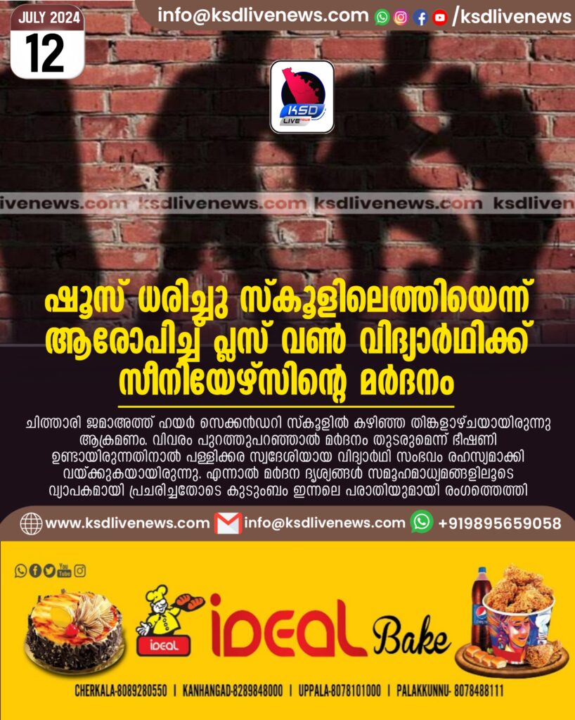 ഷൂസ് ധരിച്ചു സ്കൂളിലെത്തിയെന്ന് ആരോപിച്ച് പ്ലസ് വൺ വിദ്യാർഥിക്ക് സീനിയേഴ്സിന്റെ മർദനം