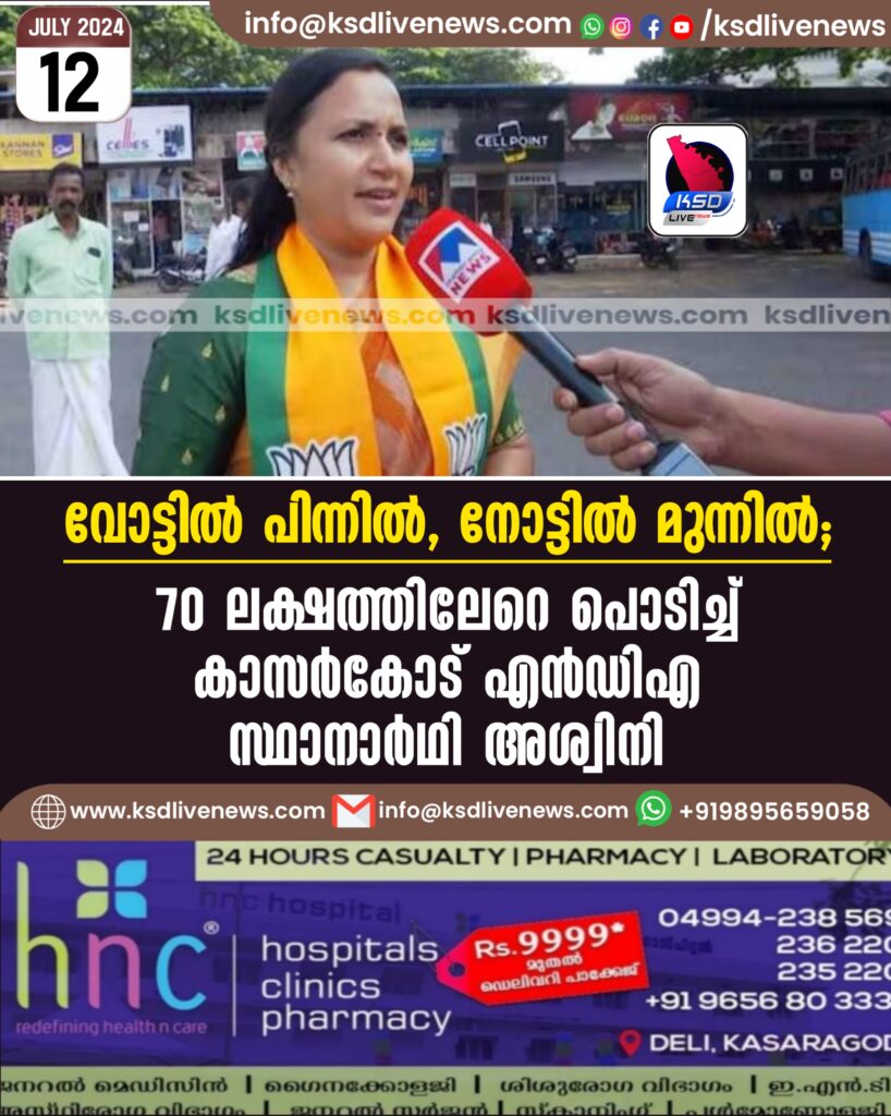 വോട്ടിൽ പിന്നിൽ, ‘നോട്ടിൽ’ മുന്നിൽ: 70 ലക്ഷത്തിലേറെ പൊടിച്ച് കാസർകോട് എൻഡിഎ സ്ഥാനാർഥി അശ്വിനി