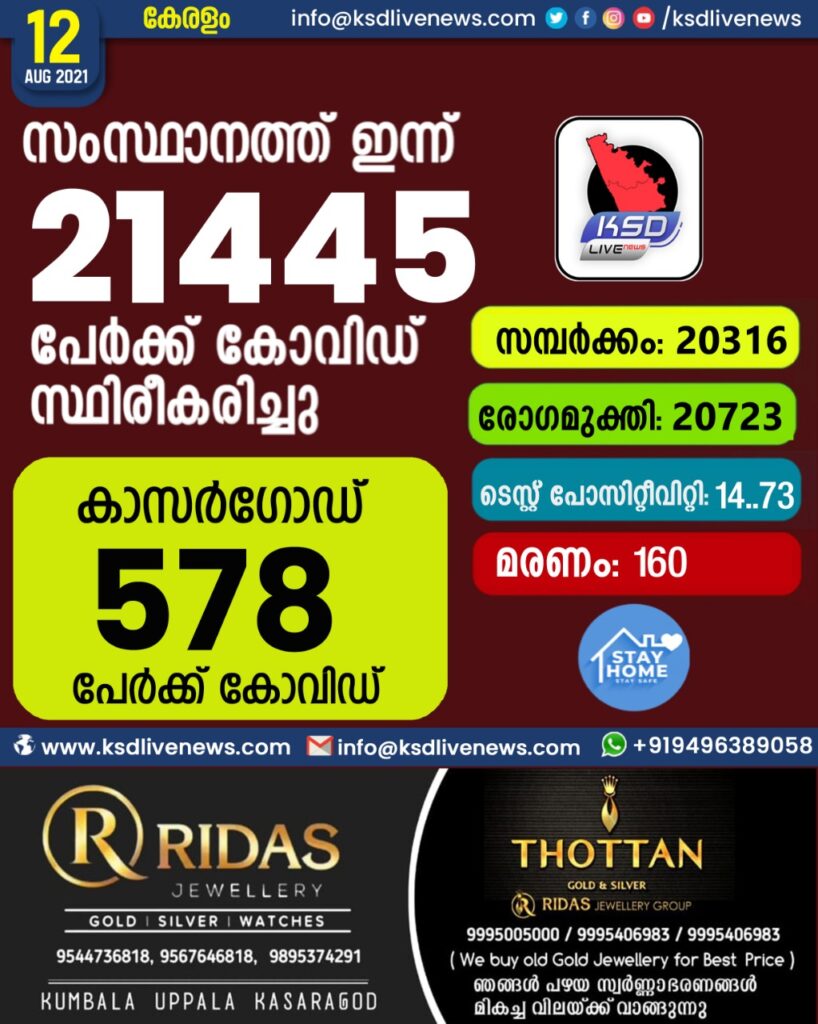 സംസ്ഥാനത്ത് ഇന്ന് 21445 പേർക്ക് കോവിഡ് സ്ഥിരീകരിച്ചു. സമ്പർക്കം വഴി 20316 പേർക്കും ; ആശ്വാസമായി 20723 പേർക്ക് രോഗ മുക്തിയും ; കാസർഗോഡ് ജില്ലയിൽ 578 പേർക്ക് പുതിയ കോവിഡ് കേസുകൾ ; മരണം 160