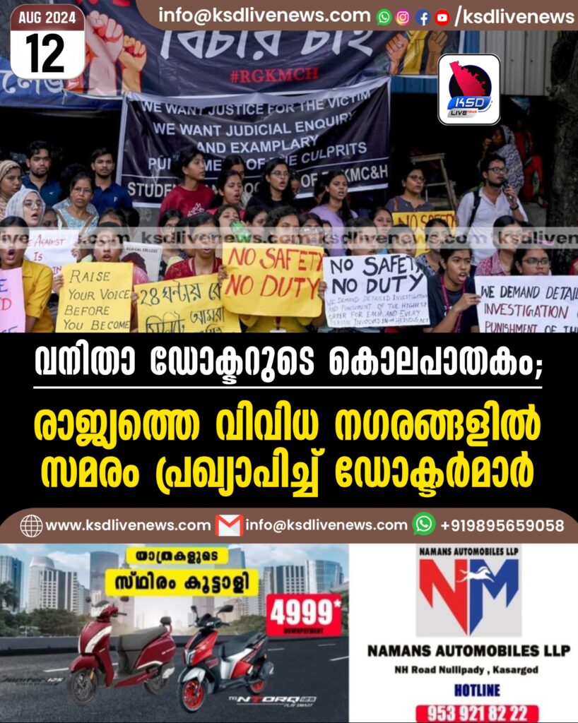 വനിതാ ഡോക്ടറുടെ കൊലപാതകം: രാജ്യത്തെ വിവിധ നഗരങ്ങളിൽ സമരം പ്രഖ്യാപിച്ച് ഡോക്ടർമാർ