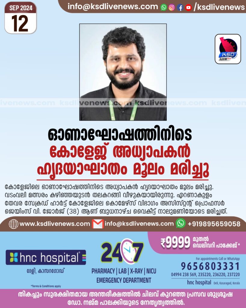 ഓണാഘോഷത്തിനിടെ കോളേജ് അധ്യാപകൻ ഹൃദയാഘാതം മൂലം മരിച്ചു