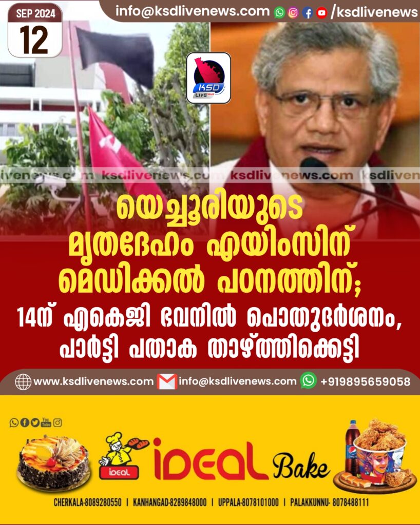 യെച്ചൂരിയുടെ മൃതദേഹം എയിംസിന് മെഡിക്കല്‍ പഠനത്തിന്, 14ന് എകെജി ഭവനില്‍ പൊതുദര്‍ശനം, പാര്‍ട്ടി പതാക താഴ്ത്തിക്കെട്ടി