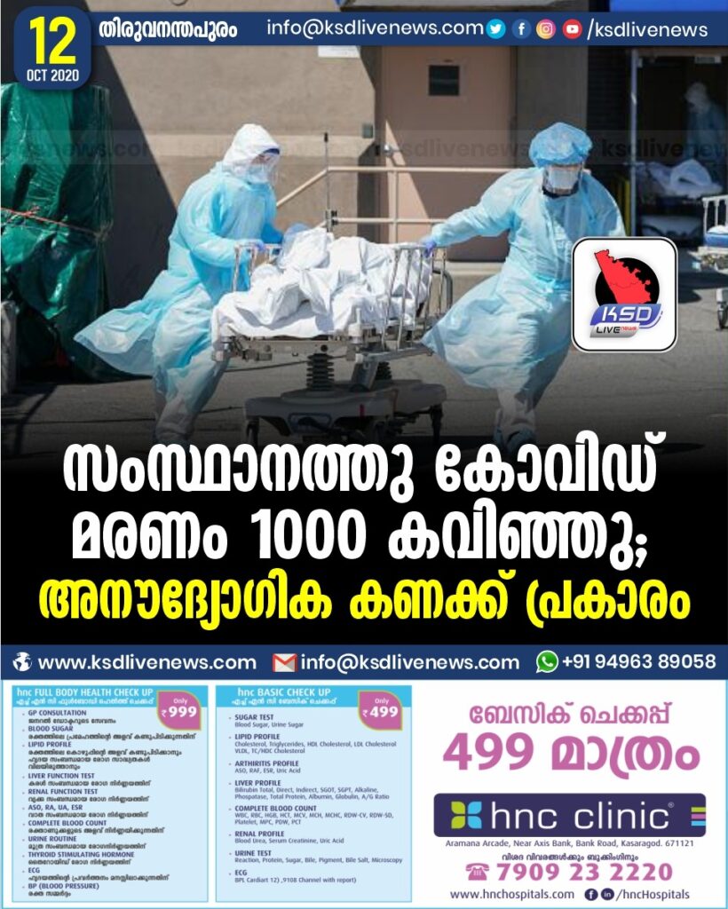 സംസ്ഥാനത്തു കോവിഡ് മരണം 1000 കവിഞ്ഞു ; അനൗദ്യോഗിക കണക്ക് പ്രകാരം