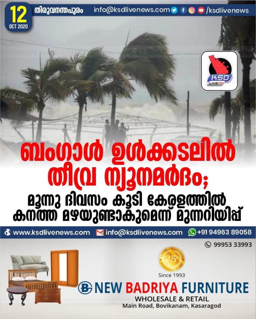 ബംഗാൾ ഉൾക്കടലിൽ തീവ്ര ന്യൂനമർദം ; മൂന്നു ദിവസം കൂടി കേരളത്തിൽ കനത്ത മഴയുണ്ടാകുമെന്ന് മുന്നറിയിപ്പ്