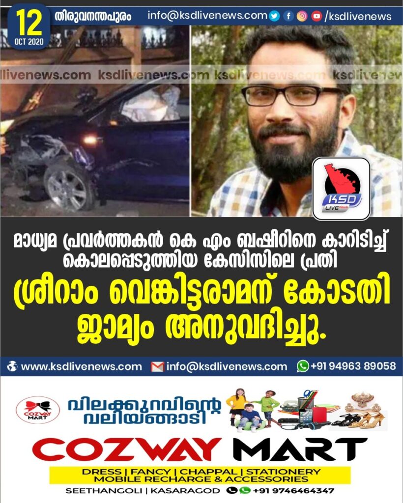 ബഷീറിനെ വാഹനം ഇടിപ്പിച്ചു കൊന്ന കേസിലെ ഒന്നാം പ്രതിയാണ് ആരോഗ്യവകുപ്പ് ജോയിന്റ് സെക്രട്ടറിയായ ശ്രീറാം വെങ്കിട്ടരാമന്‍.കേസിലെ രണ്ടാം പ്രതി ശ്രീറാമിന്റെ സുഹൃത്ത് വഫ ഫിറോസ് നേരത്തെ കോടതിയില്‍ ഹാജരായി ജാമ്യമെടുത്തിരുന്നു. 50,000 രൂപയുടെ സ്വന്തം ജാമ്യ ബോണ്ടിന്‍മേലും തുല്യ തുകയ്ക്കുള്ള രണ്ടാള്‍ ജാമ്യ ബോണ്ടിന്‍മേലുമാണ് കോടതി ജാമ്യം അനുവദിച്ചത്.