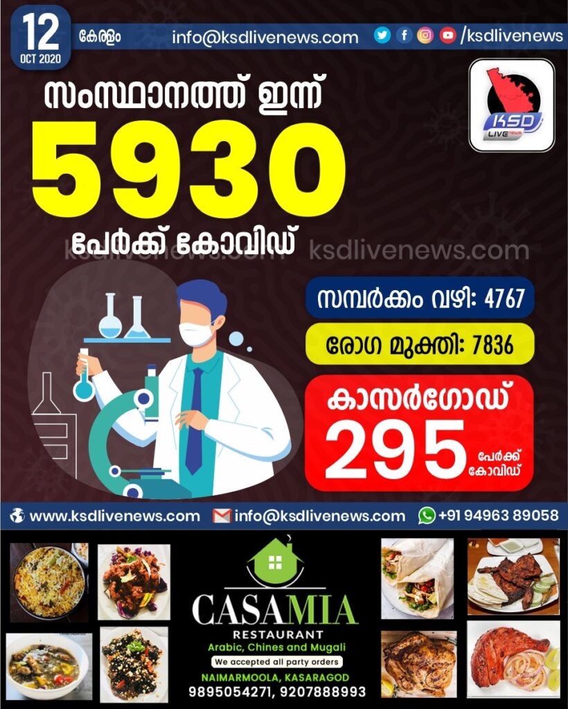 ഇന്ന് കോവിഡിന്ന് അല്പം ആശ്വാസമുണ്ട് ; സംസ്ഥാനത്ത് ഇന്ന് 5930 പേർക്ക് കോവിഡ് സ്ഥിരീകരിച്ചു. സമ്പർക്കം വഴി 4767 പേർക്കും.രോഗ മുക്തി 7836 പേർക്കും. കാസർഗോഡ് ജില്ലയിൽ ഇന്ന് 295 പേർക്ക് കോവിഡ് സ്ഥിരീകരിച്ചു. മരണം 22